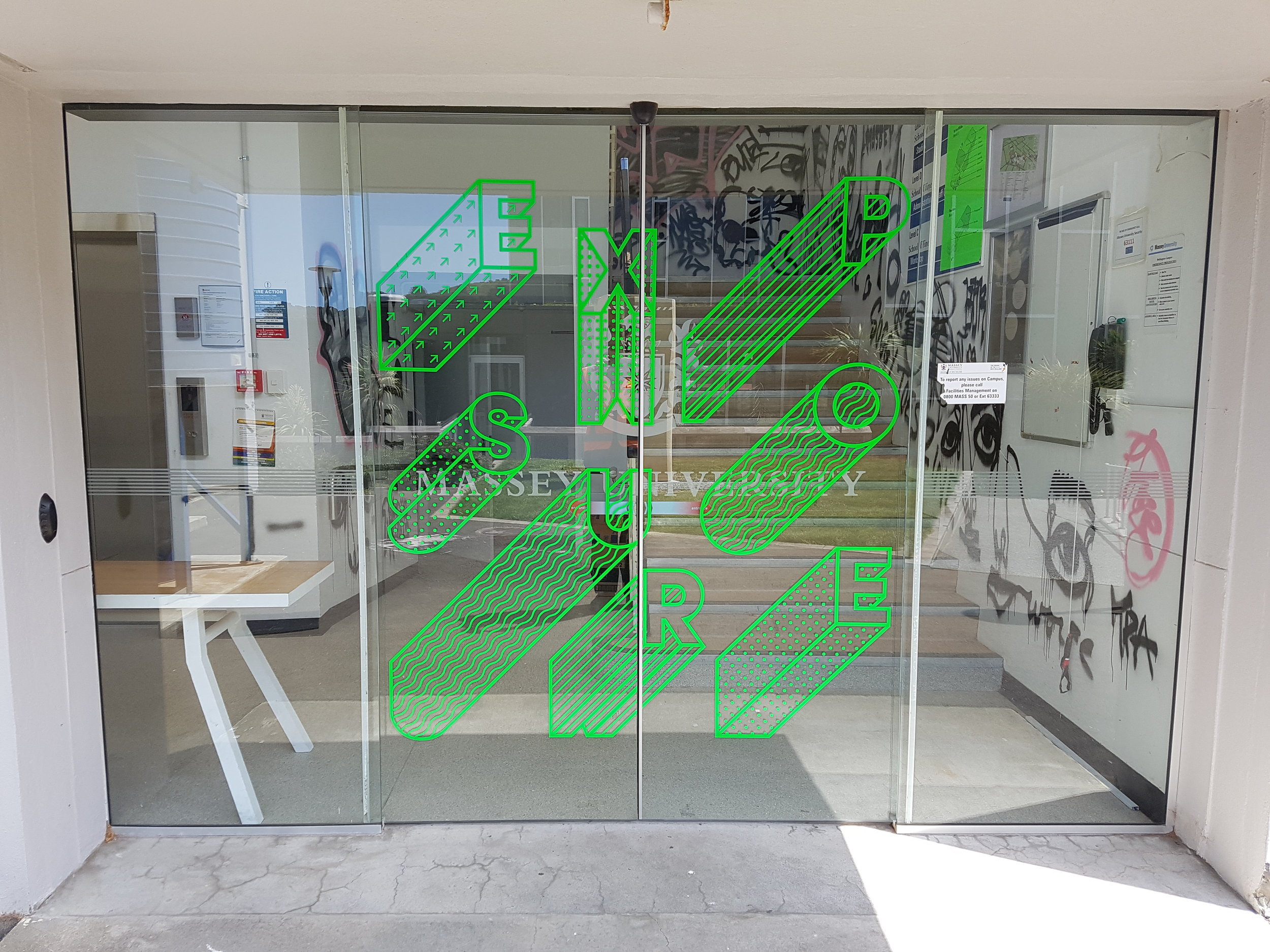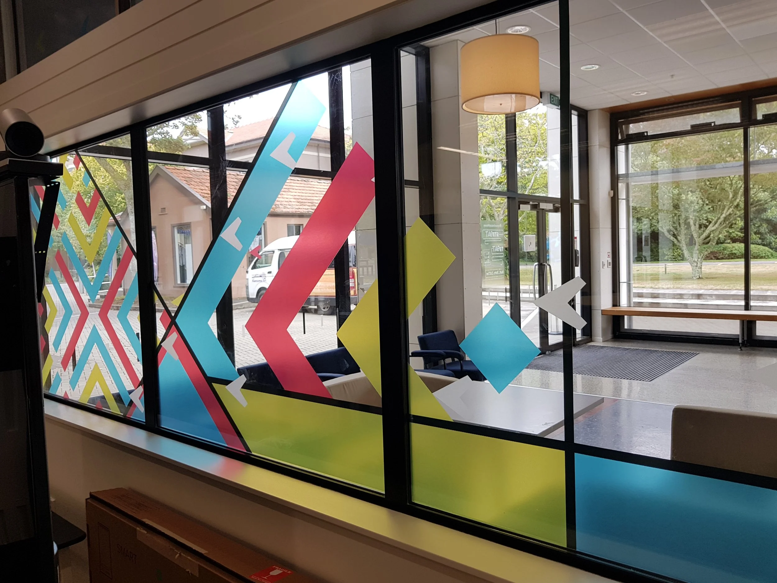 The Massey Business School commissioned Awesome Art to create an original, eye-catching and dynamic design. Utilising the Massey brand and a primary colour palette we told a story through there design, the arrows show movement and growth through education, the stylised Tukutuku pattern weaves all peoples together creating inclusiveness and togetherness. The symbolised hills and rivers start from the first panel and travel down the windows towards the doors. This allows the viewer to see and interpret this to represent pepeha for their own story, showing mountains, rivers and feilds.
