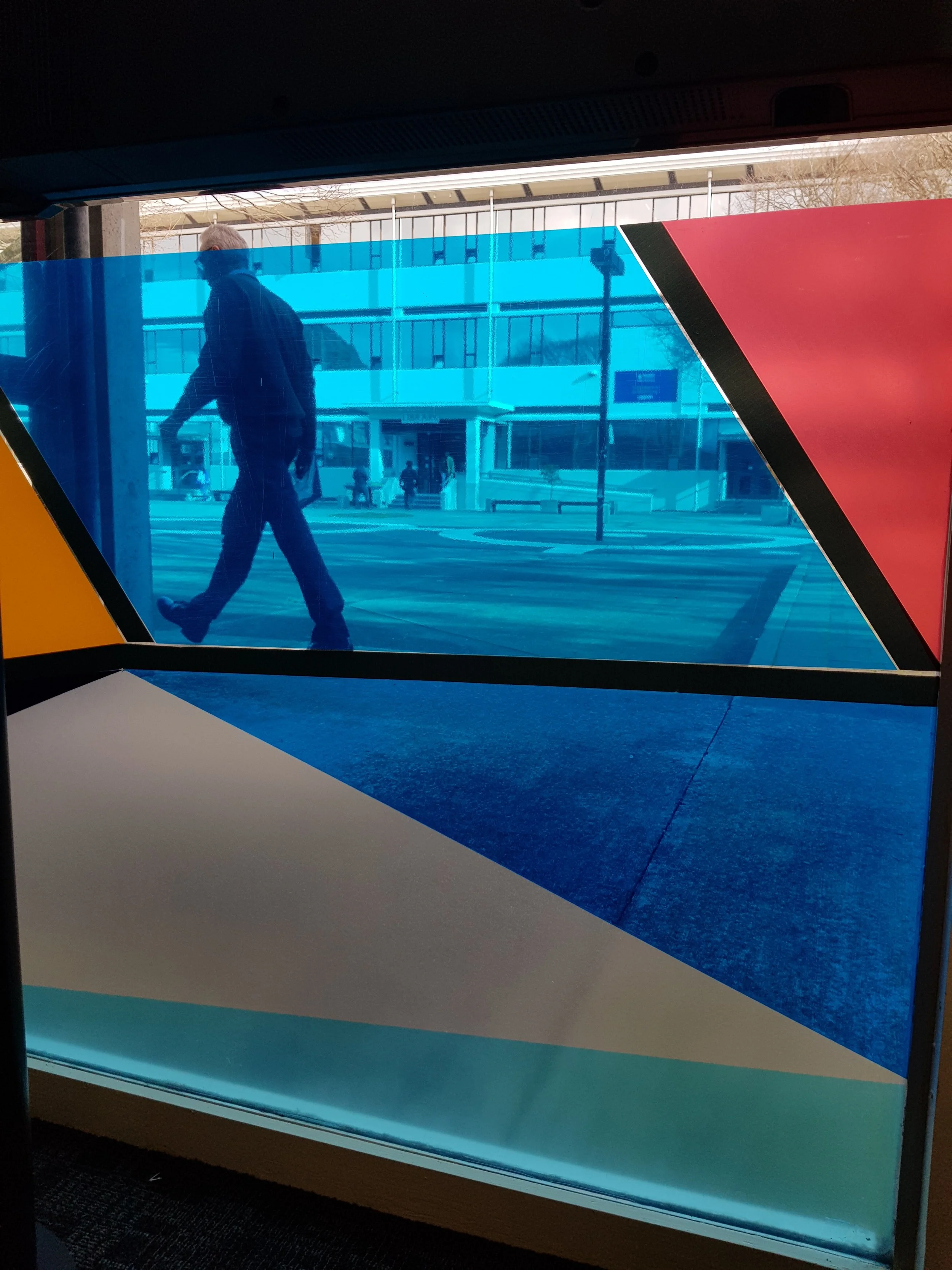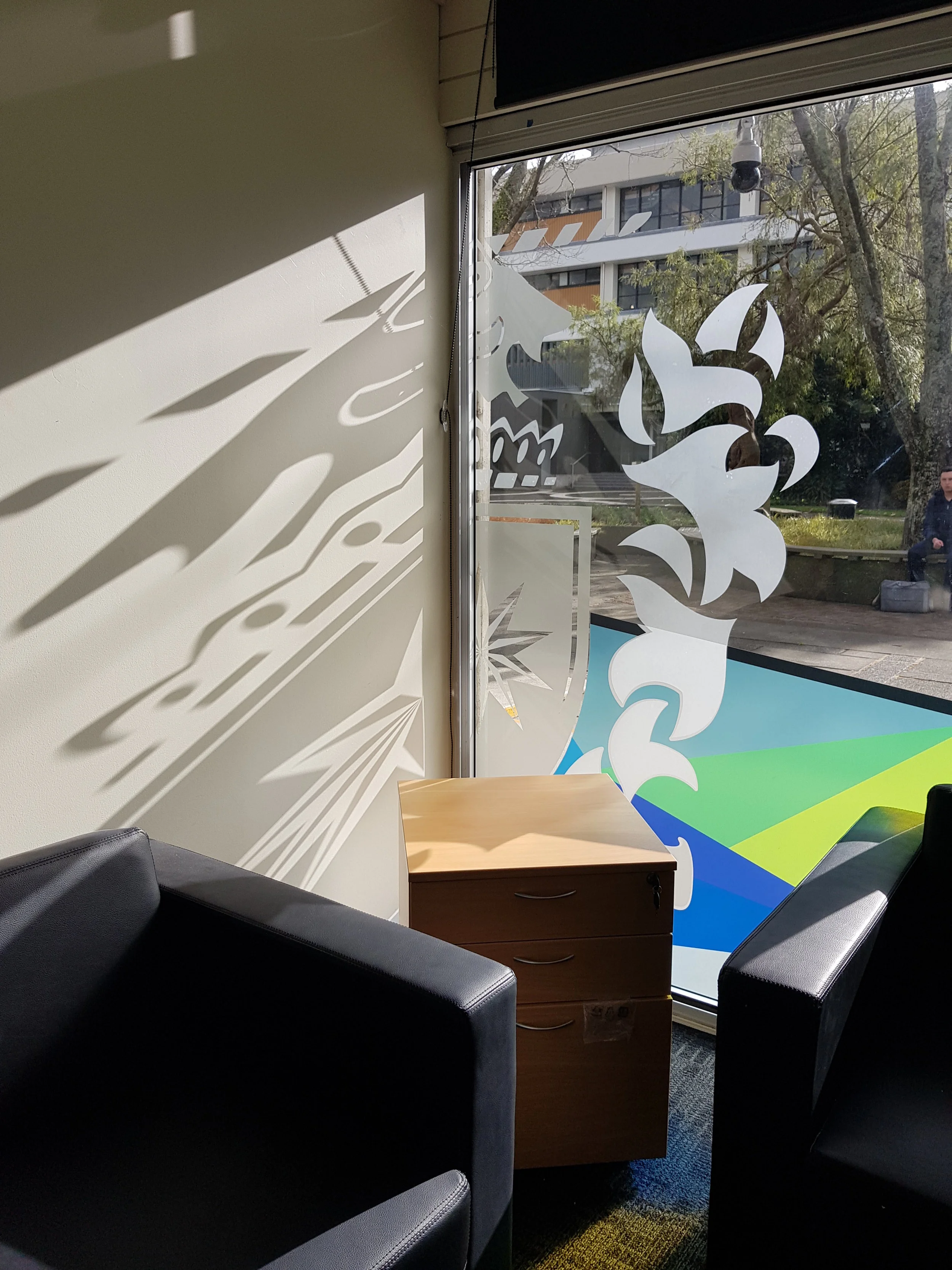 Massey Business School commissioned Awesome Art again to create a vibrant and eye catching design for the Manawatu Campus. The colour palette was allowed to be wider and more vibrant, utilising the arrows and the Massey Brand we create a story that was specific to Te Papaioea, the Ruahine and Tararua Mountains, Whariti Peak, the Manawatu River and Apiti Windfarms. The geometric hills expand with the design to the wider flat of Papaioea and the design gets looser towards the vaishing point, the river winds from the Massey University Crest in it geographic location and down towards the coast. Fine details of paths, roads, water troughs are featured in the feilds. The design is layered on the inside and outside of the glass to create shadows, texture and play with the light.